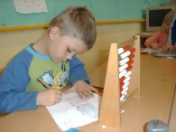 Ein Kind arbeitet mit einem Abakus.