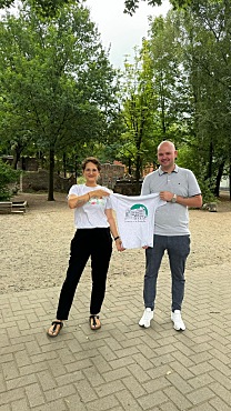 Hier präsentieren Frau Strauß (Konrektorin) und Herr Selke (Geschäftsführung Firma Biorelax) die Schul-T-Shirts der Grundschule an der Nordstraße
