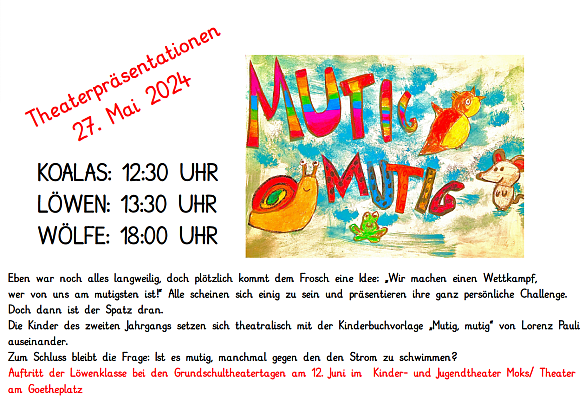 Bald ist es wieder soweit! Die zweiten Klassen präsentieren das Theaterstück, das sie gemeinsam mit Frau Jordi entwickelt und eingeübt haben. Komm vorbei und sieh dir die Ergebnisse der Wölfe, Koalas und Löwen an!