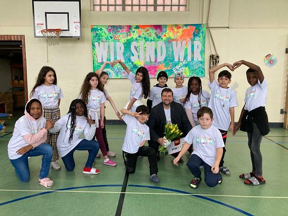 Mit der Unterstützung von Herrn Kai Wolfermann und seiner Firma TerraVista-Erlebnisreisen wurde es uns nun ermöglicht Schul-T-Shirts mit unserem Motto zu gestalten und jedes Kind unserer Schule kostenfrei damit auszustatten. Am vergangenen Freitag, 03.02.23, wurden die T-Shirts überreicht und wir freuen uns sehr, dass wir die Chance hatten uns persönlich und mit einer kleinen Feier bei Herrn Wolfermann für seine großzügige Spende zu bedanken. Zu diesem Anlass haben wir gemeinsam unseren Schulsong gesungen. Außerdem haben die Erdmännchen eine Tanz-Choreografie aufgeführt, die sie beim Theater eingeübt haben.