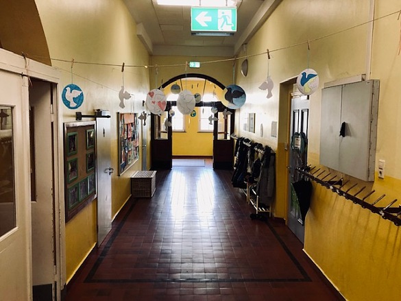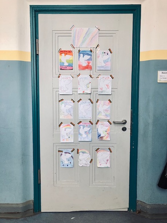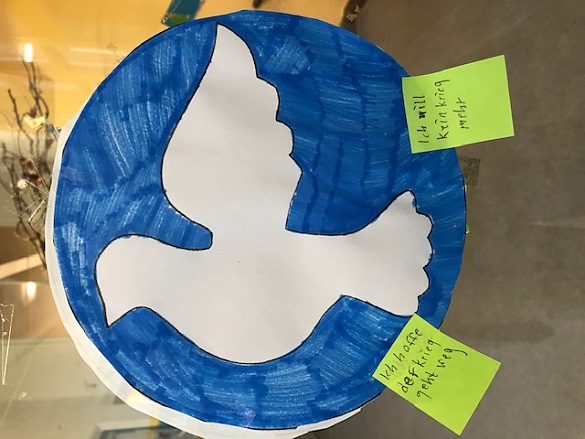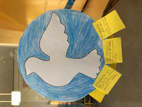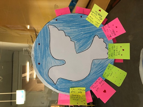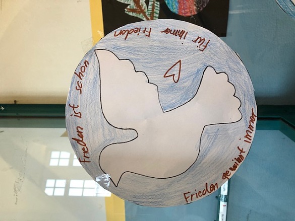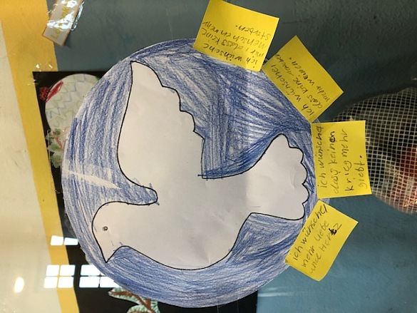 Im Gespräch mit den Kindern über Krieg und Frieden sind in verschiedenen Klassen diese Friedenstauben entstanden. Sie hängen bei uns im Flur und zeigen, was sich die Kinder wünschen: "mehr Liebe und Herz".